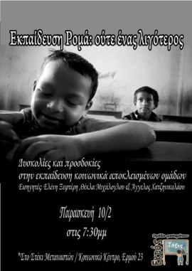 ΥΓ. Προσπαθούμε μέχρι τελευταία στιγμή να συμμετάσχουν στην εκδήλωση και γυναίκες Ρομά από το αντίστοιχο πρόγραμμα εκπαίδευσης ενηλίκων. Δεν είναι εύκολο. Αλλά και αυτή η δυσκολία έκφρασης δημόσιου λόγου από τα ίδια τα κοινωνικά αποκλεισμένα υποκείμενα θεωρούμε ότι δικαιώνει την επιλογή μας να ασχοληθούμε με το συγκεκριμένο ζήτημα, παρότι θα μπορούσε να θεωρηθεί ότι ανήκει στο περιθώριο της σημερινής κοινωνικοπολιτικής συγκυρίας.