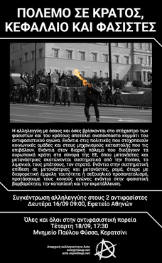Ας ξαναγίνει σαφές και εν όψει της 16ης Σεπτεμβρίου: κανείς, ούτε ένας, φασίστας ρουφιάνος δεν θα βρει χώρο μέσα σε αυτή τη δίκη. Η πολιτική δίωξη των δύο αγωνιστών συντρόφων μας θα βρει απέναντι της και πάλι ένα ισχυρό αντιφασιστικό, αντιεξουσιαστικό, αντικαπιταλιστικό κίνημα αλληλεγγύης.