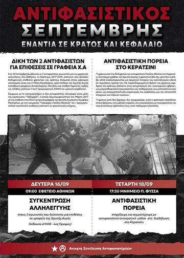 Τη Δευτέρα 16 Σεπτεμβρίου, δύο μόλις μέρες πριν συμπληρωθούν 11 χρόνια από τη δολοφονία του αντιφασίστα Παύλου Φύσσα από τον χρυσαυγίτη Ρουπακιά, έχει οριστεί η έναρξη της δίκης των 2 αντιφασιστών που κατηγορούνται ότι συμμετείχαν σε 6 μαχητικές απαντήσεις που δώθηκαν σε φασιστικούς στόχους την περίοδο 2017-2019. Κύριοι μάρτυρες κατηγορίας είναι ο Ηλίας Κασιδιάρης ως τότε υπεύθυνος των γραφείων της Δηλιγιάννη, τρεις Χρυσαυγίτες που ήταν υπεύθυνοι των τότε γραφείων του Ασπρόπυργου, του Μενιδίου και του σταθμού Λαρίσης, καθώς και πλήθος μπάτσων της «αντι»τρομοκρατικής, των Ε.Κ.Α.Μ. και της κρατικής ασφάλειας.