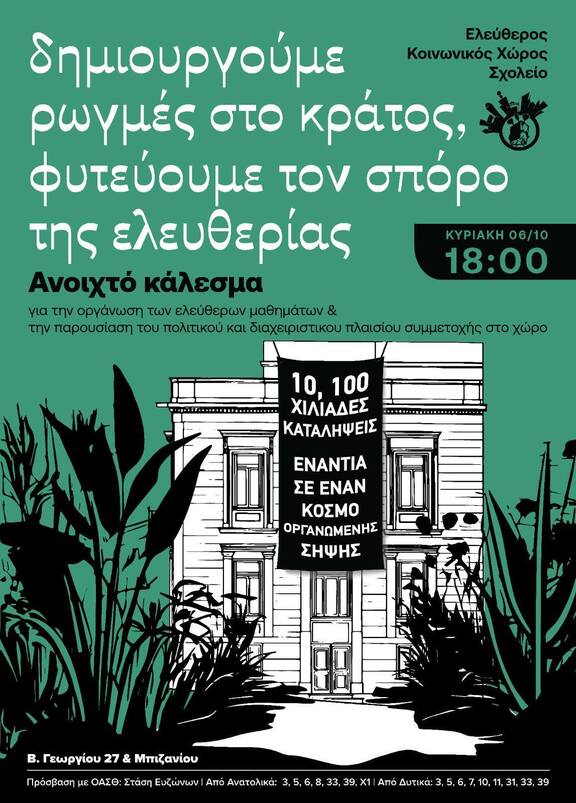 Έτσι λοιπόν, σας καλούμε όλους, -ες, -α στο άνοιγμα του 15ου έτους λειτουργίας του Ελεύθερου Κοινωνικού Χώρου Σχολείο, όπου θα πραγματοποιηθεί αυτοπαρουσίαση του εγχειρήματος, των πολιτικών και κοινωνικών προεκτάσεων του, θα συζητήσουμε όλοι και όλες μαζί σχετικά με τη λειτουργία του χώρου και των δραστηριοτήτων, θα προτείνουμε και θα οργανώσουμε την δημιουργία/συνέχιση των ελεύθερων μαθημάτων, θα ζυμωθούμε και θα σχεδιάσουμε την νέα «σχολική χρονιά».