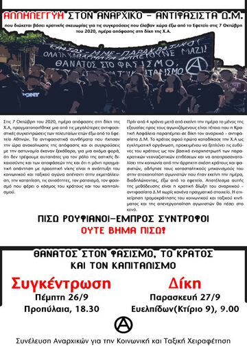 Το «τείχος της δημοκρατίας» και η θεσμική δικαιοσύνη καταδίκασε την Χ.Α ως εγκληματική οργάνωση προκειμένου να ξεπλύνει τις ευθύνες του κράτους ως τον βασικό ενορχηστρωτή των παρακρατικών νεοναζιστικών επιθέσεων και να αποπροσανατολίσει την κοινωνία από την άρρηκτη σχέση κράτους και φασιστών. Καταδίκασε τη Χ.Α. ως αποτέλεσμα της κοινωνικής πίεσης και εκβιαζόμενο από την πιθανότητα να απωλέσει κάθε νομιμοποίηση μετά τη δολοφονία του αντιφασίστα Παύλου Φύσσα, αφήνοντας τα παρακρατικά τάγματα εφόδου να δρουν ανενόχλητα. Την ώρα ανακοίνωσης της απόφασης καταδίκης, ξεσπούν συγκρούσεις στη λεωφόρο Αλεξάνδρας με τα ένστολα καθάρματα της δημοκρατίας να επιτίθονται στους χιλιάδες συγκεντρωμένους. Και είναι τέτοιο το μένος της εξουσίας απέναντι στους αγωνιζόμενους που η Κρατική Ασφάλεια εκκίνησε έρευνα για τη στοχοποίηση αγωνιστών που συμμετείχαν στη συγκέντρωση, καλλιεργώντας τη θεωρία των δύο άκρων. Αποτέλεσμα αυτής της μεθόδευσης είναι η κρατική δίωξη του αντιφασίστα-αναρχικού Δ.Μ. που δικάζεται βάσει ενός σαθρού κατηγορητηρίου και χωρίς πραγματικά στοιχεία με αποκλειστικό στόχο, μαζί με την επιχείρηση τρομοκράτησης και απενεργοποίησης ενός σταθερού και συνεπή αγωνιστή, την εκδίκηση του κράτους απέναντι στους πολιτικούς του αντιπάλους και τη συνέχιση της κατασταλτικής εκστρατείας απέναντι σε όλους όσοι αγωνίζονται. Ο Δ.Μ. είναι ένας από εμάς και την επίθεση που δέχεται την αντιλαμβανόμαστε ως επίθεση απέναντι σε όλες και όλους μας, απέναντι στους δεκάδες χιλιάδες που βρέθηκαν εκείνη την ημέρα έξω από το Εφετείο, σε όσους συνεχίζουν τον αδιαπραγμάτευτο μαχητικό, ριζοσπαστικό αγώνα απέναντι σε κράτος, κεφάλαιο και φασίστες.