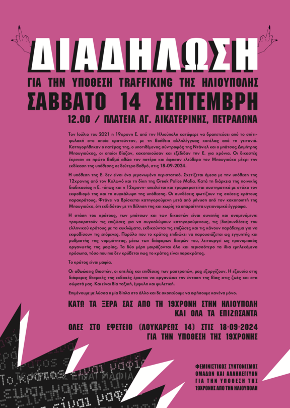 Την Τετάρτη 18.9 ξεκινά το εφετείο της υπόθεσης της Ηλιούπολης. Μιας υπόθεσης αποκαλυπτικής των σύγχρονων κοινωνικών, θεσμικών και συστημικών προεκτάσεων της έμφυλης βίας, και του trafficking ειδικότερα. Το καλοκαίρι του 2021, η Ε. βρήκε το θάρρος, με τη βοήθεια εργαζόμενης της γειτονιάς, να αποδράσει από το σπίτι-φυλακή στην Ηλιούπολη όπου κρατούνταν αιχμάλωτη από τον μπάτσο βιαστή και μαστροπό Μπουγιούκο. Βρήκε το κουράγιο να καταγγείλει τον βιαστή πατέρα της, καθώς και τον υποτιθέμενο «σύντροφό» της Ντάνιελ, ο οποίος επίσης τη βίαζε και την εξανάγκαζε να εκδίδεται.