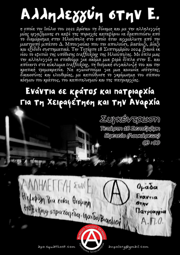 Πλέον, ενάμιση χρόνο μετά την πρωτόδικη απόφαση, εκτός από το ότι ο μαστροπός Μπουγιούκος με δημόσιες αναρτήσεις έχει απειλήσει την Ε., την οικογένειά της καθώς και τον αλληλέγγυο κόσμο που την στήριξε σε όλη αυτή τη διαδρομή, και αφού συνεχίζει απρόσκοπτα το βίο του διατυμπανίζοντας πως εκτός από μαφιόζος, βιαστής και μπάτσος είναι και φασίστας, η αστική δικαιοσύνη αποφασίζει να διώξει την Ε. ώστε να συνεχιστεί αυτή η αλυσίδα συνεχών απειλών, τρομοκρατήσεων και εκδικητικότητας απέναντι σε έναν άνθρωπο που καταγγέλλοντας την εκμετάλλευσή της έριξε φως στα πιο σκοτεινά, σάπια κομμάτια της πραγματικότητας που έχει δημιουργήσει ο βάρβαρος κόσμος κράτους και καπιταλισμού.
