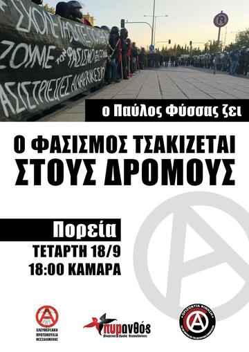 Στην πορεία της 18ης Σεπτεμβρίου, λοιπόν ο αντιφασίστας Παύλος Φύσσας και η επέτειος της δολοφονίας του είναι για εμάς απλά η αφορμή για να βρεθούμε στον δρόμο. Γιατί τα πραγματικά αίτια είναι εδώ , ολοζώντανα και πιο καθαρά από ποτέ. Το αντιφασιστικό κίνημα οφείλει, ως κομμάτι του ευρύτερου ανταγωνιστικού κινήματος, να μπολιαστεί με αμιγώς ταξικά χαρακτηριστικά και να δώσει τις απαντήσεις που αρμόζουν τόσο στις φασιστικές τάσεις του σήμερα αλλά και γενικότερα στο σύστημα που τις θρέφει και τις κανονικοποιεί. Οφείλουμε να είμαστε εκεί για να πιάσουμε το νήμα των αδιαμεσολάβητων αντιφασιστικών αγώνων του χθες και να τους φέρουμε στο σήμερα. Να συνδεθούμε με τις καταπιεσμένες ομάδες και να κάνουμε πράξη τις μαχητικές κοινότητες αγώνα ενάντια στον φασισμό. Να διαρρήξουμε το αφήγημα της εθνικής ενότητας που επιδιώκουν κράτος και φασίστες σε όλα τα κοινωνικά πεδία , από τα σχολεία μέχρι τους χώρους εργασίας, και να φωτίσουμε τα σημεία καταπίεσης με κατεύθυνση την ταξική συνείδηση που οφείλει να έχει ένα, από τα κάτω , αντιφασιστικό κίνημα. Να αγωνιστούμε από κοινού με τον μετανάστη συνάδελφο μας ενάντια στην καθημερινή μας εκμετάλλευση από τα αφεντικά. Να σπάσουμε την μονοτονία των επετειακών πορειών και να κάνουμε τους αγώνες μας επικίνδυνους στο σήμερα.