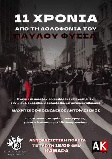 Η συμπλήρωση 11 χρόνων από την δολοφονία του Παύλου Φύσσα μας βρίσκει σε μια κοινωνική συγκυρία στην οποία το αντιφασιστικό κίνημα καλείται να δώσει και πάλι καθημερινές μάχες σε διάφορα μέτωπα . Μπορεί η Χρυσή Αυγή , το ναζιστικό μόρφωμα - κύριος εκφραστής της ακροδεξιάς στα προηγούμενα χρόνια- να έχει υποχωρήσει όμως τα αντιμεταναστευτικά πογκρόμ και τα pushbacks , η διάχυτη κοινωνική βία σε βάρος τρανς, κουιρ ατόμων από φασιστικές γκρούπες και το γενικότερο ρατσιστικό πλαίσιο που αποτελεί δομικό στοιχείο του καπιταλιστικού συστήματος είναι ακόμα εδώ. Τις "δουλειές" που άλλοτε το κράτος ανέθετε στα τάγματα εφόδου της χρυσής αυγής πλέον είναι σε θέση να τις φέρει μόνος του εις πέρας, ντύνοντας τες με μια τρόπον τινά κοινωνική νομιμοποίηση για την διατήρηση της κανονικότητας στην λειτουργία της καπιταλιστικής μηχανής. Η ρατσιστική κρατική προπαγάνδα είναι αυτή που στρώνει το έδαφος ώστε Ρομά, μετανάστριες και λοιπές ομάδες που δεν ταιριάζουν στο εθνικό αφήγημα της χώρας να δέχονται καθημερινό πόλεμο σε κάθε πτυχή της ζωής τους. Δεν είναι πλέον οι δολοφόνοι της χρυσής αυγής που σκοτώνουν εν ψυχρώ τον Πακιστανό εργάτη Σαχζάτ Λουκμάν αλλά τα ένστολα καθάρματα της ΕΛΑΣ που εκτελούν τους ανήλικους Ρομά Σαμπάνη, Φραγκούλη, Μιχαλόπουλο και τον Σύριο μετανάστη Καλαφ Ασαντ. Δεν είναι κάποια ναζιστικά σκουπίδια της χρυσής αυγής που σπάνε πάγκους Ρομά και Αφρικανών μικροπωλητών στην λαϊκή της Ξηροκρήνης αλλά αυτό αποτελεί πλέον εξαγγελία και αρμοδιότητα της τοπικής αυτοδιοίκησης της πόλης.