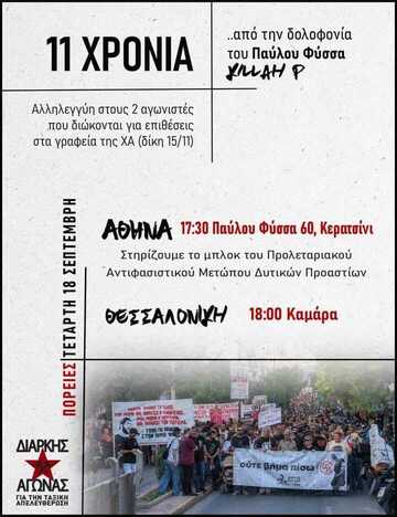 Στις 18 Σεπτέμβρη μετράμε 11 χρόνια από την δολοφονία του αντιφασίστα Παύλου Φύσσα, ο οποίος μαχαιρώνεται θανάσιμα από τον Γ. Ρουπακιά, μέλος των παρακρατικών ταγμάτων εφόδου της Χ.Α. Το κράτος θέλοντας να ενισχύσει το προσωπείο της δικαιοσύνης καταδικάζει την Χρυσή Αυγή σε εγκληματική οργάνωση με ορισμένα από τα ηγετικά στελέχη και μέλη των ταγμάτων εφόδου να καταδικάζονται και να οδηγούνται πρόσκαιρα στην φυλακή. Η δίκη της Χρυσής Αυγής αποτέλεσε ένα ακόμα περίτεχνο σχέδιο του κράτους να παρουσιαστεί ως εγγυητής της κοινωνικής ομαλότητας παραπλανώντας την κοινή γνώμη - μιας που σήμερα οι περισσότεροι φασίστες βρίσκονται ελεύθεροι.
