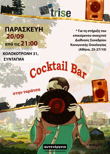 To μπαρ γίνεται για τη στήριξη του επικείμενου ανοιχτού Διεθνούς Συνεδρίου Κοινωνικής Οικολογίας που διοργανώνει το TRISE στην Αθήνα τον Οκτώβρη, 25-27/10, υπό τον τίτλο "The Politics of Social Ecology"!