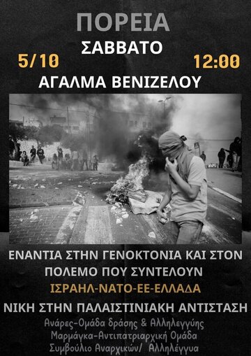 Κι ενώ το ελληνικό κράτος προσπαθεί να πλασάρει αυτη τη φιλοφεμινιστική και προοδευτική βιτρίνα προκειμένου να μας κατευνάσει και να μας πείσει για τους αγαθούς σκοπούς του, παράλληλα διεξάγει πόλεμο στο εξωτερικό του και συμμετέχει ενεργά στους διακρατικούς ανταγωνισμούς. Και σε όλα αυτά απαιτεί και τη δική μας συμμετοχή και συναίνεση. Λες και δε ξερουμε οτι εμπλοκή σε ενα πόλεμο σημαίνει τον εκτοπισμό μας ή περαιτέρω πειθάρχηση και εξόντωση των εσωτερικών εχθρών, χαμηλότερη ποιότητα ζωής, περαιτέρω στρατιωτικοποίηση κι αστυνομοκρατια. Δε θα γίνουμε κρέας για οβίδες, δε θα πολεμήσουμε για τα συμφέροντα κανενός κράτους. Οσο πιο νωρίς το αντιληφθούμε κι αυτοοργανωθούμε τόσο πιο προετοιμασμένα θα είμαστε για την επόμενη εθνική κρίση που δεν είναι άλλη απο την καπιταλιστική. Για αυτό και εμείς κοιτάμε τα δικά μας συμφέροντα, αυτα του ανώμαλου πολυεθνικού προλεταριάτου. Τασσόμαστε με τις αντιστεκόμενες, με τους εκτοπισμένους, με τα κολασμένα και τα ανώμαλα αυτης της γης. Δείχνουμε την αλληλεγγύη μας σε κάθε παλαιστίνιο/α που αντιστέκεται με κάθε μέσο που διαθέτει, από τα μικρά παιδιά που πετάνε πέτρες στο τείχος και κάθε άτομο που βάζει το σωμα του ανάχωμα στον αφανισμό, που ζει καθημερινα με το φοβο του βομβαρδισμου ή του διωγμου του. Μη ξεχνάμε ότι και στην ελλαδα έχουν γίνει απεργίες πείνας έγκλειστων μετανασ(τρι)ών εις ενδειξη αλληλεγγύης με την Παλαιστίνη ή και για αναστολή ποινής απέλασης λογω συμμετοχής σε δράσεις υπερ της Παλαιστίνης. Επίσης, καθ'ολη τη διάρκεια του γενοκτονικού πολέμου έχει ξεσπάσει ενα ευρυτερο διεθνιστικό κίνημα αλληλεγγύης και καταλήψεων υπερ της Παλαιστίνης σε ολο τον κοσμο το οποίο οφείλουμε και να ακολουθήσουμε.Να σταθούμε στο πλευρό του παλαιστινιακού πληθυσμού και να προσπαθήσουμε με όποιον τρόπο μπορούμε να είμαστε αλληλέγγυα και να δίνουμε ορατότητα στην φρικαλέα εξόντωση τους, αποβάλλοντας κάθε παραπλανητικό δικαιολογητικό μανδύα από αυτό που συμβαίνει.Μη σιωπούμε σε μια γενοκτονία. Να μπλοκάρουμε την πολεμική μηχανή της ελλαδας.