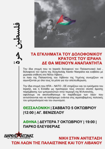 Διαδήλωση αλληλεγγύης στον Παλαιστινιακό και τον Λιβανέζικο λαό, Σάββατο 05/10, στις 12:00, στο Άγαλμα Βενιζέλου