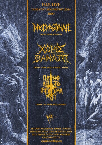 Το ερχόμενο Σάββατο, 7 του Δεκέμβρη, στήνουμε το τελευταίο live του 2024 μαζί με τους Procrastinate από Καρδίτσα, τους Χωρίς Θάνατο από Θεσσαλονίκη και Λάρισα και τους Πάνω Απ'το Πτώμα Μου από Θεσσαλονίκη επίσης. Από τις 21:00.