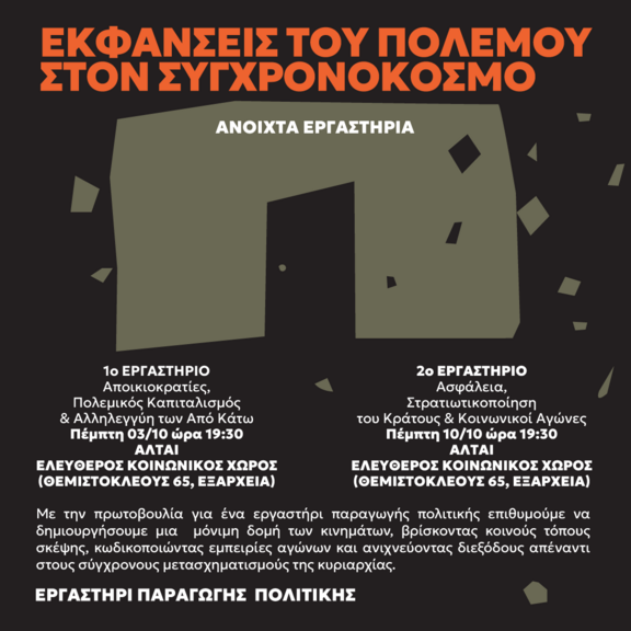 Ζούμε σε μια περίοδο όπου η συζήτηση για τον πόλεμο είναι μια γενικευμένη συνθήκη. Η βία του στρατιωτικοποιημένου κράτους καθώς και η βία των οργανωμένων εγκληματικών ομάδων και η βίαιη κυριαρχία πάνω στις καταπιεζόμενες τάξεις, που αυτό συντηρεί, αποτελούν φαινόμενα που διαπερνούν την ιστορία και επηρεάζει την συνοχή των κοινοτήτων μας. Μιλάμε για συνθήκη στην οποία η βία του (παρα)κράτους και των κυρίαρχων ομάδων που αυτό συντηρεί είναι διάχυτη και ο «εχθρός» εντοπίζεται σε συγκεκριμένες κοινωνικές ομάδες, τους μετανάστες, τα λοατκι άτομο κ.α. πάνω στις οποίες ασκούνται διάφορες μορφές εξουσίας που γίνονται αντιληπτές ως πολεμικές.