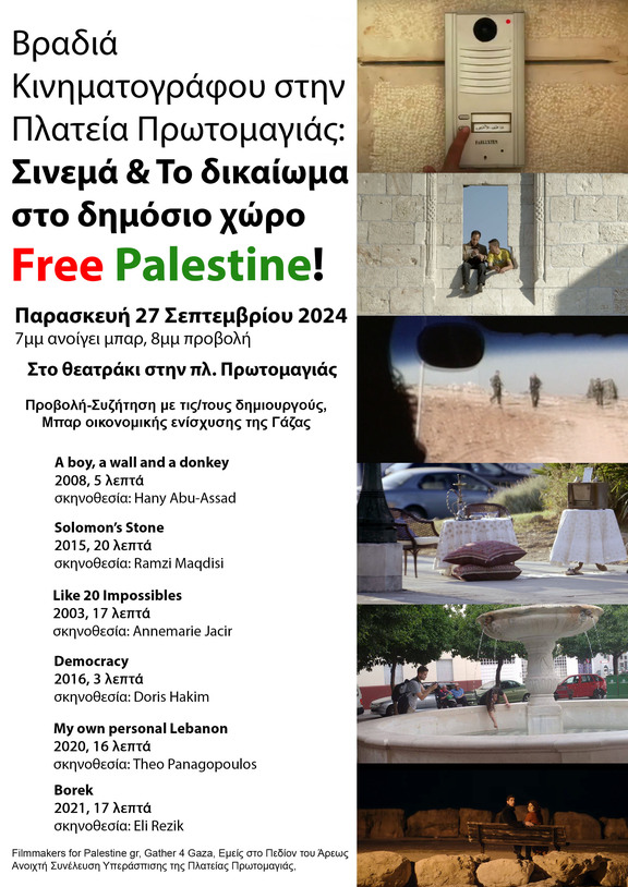 In the context of the film series "Cinema and the right to public space", Filmmakers for Palestine, Gather for Gaza, Emeis sto Pedio tou Areos and the Open Assembly of Struggle for Plateia Protomagias invite you for a screening and public discussion of short films exploring liberation struggles through the right to public space from the perspectives of Palestinian filmmakers living in Palestine and the diaspora.