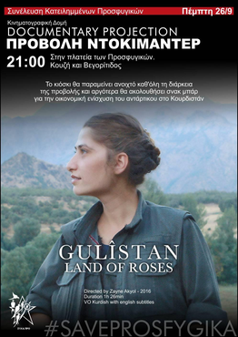 Σας καλούμε σε μια βραδιά για την οικονομική ενίσχυση του αντάρτικου στο Κουρδιστάν. Θα προβληθεί το ντοκιμαντέρ Gulistan και θα ακολουθήσει σνακ μπαρ. Η κατάσταση στα βουνά του Κουρδιστάν είναι πιο επείγουσα από ποτέ. Ο τουρκικός στρατός, ο 2ος μεγαλύτερος στρατός του ΝΑΤΟ, επιτίθεται με χημικά όπλα, βαρομετρικές βόμβες και αεροσκάφη, ενώ με τη βοήθεια της κυβέρνησης του ιρακινού Κουρδιστάν επεκτείνει τα σύνορα του περνώντας χερσαίες δυνάμεις και βαριά οχήματα μάχης. Το αντάρτικο, όχι μόνο αντιστέκεται σε αυτόν τον βρόμικο πόλεμο και προστατεύει την κοινωνία που βλέπει τα χωριά τις, τους τόπους της να πυρπολούνται, αλλά καταφέρνει ισχυρά πλήγματα στον εχθρό. Μικρές αντάρτικες ομάδες εξοπλισμένες με τα απαραίτητα εφόδια ώστε να είναι αόρατες από την ανεπτυγμένη τεχνολογία του εχθρού εισβάλουν στις γραμμές του και τον ισοπεδώνουν. Παράλληλα έχουν αναπτύξει αεράμυνα με ντρόουνς αυτοκτονίας που εκρήγνυνται απευθείας στην καρδιά του εχθρού. Είναι ζήτημα να συνεισφέρουμε με τις μικρές μας δυνάμεις στον αγώνα για την απελευθέρωση του Κουρδιστάν. Αυτήν τη στιγμή, το αντάρτικο χρειάζεται αντιασφυξιογόνες μάσκες ώστε να μπορεί να αντεπεξέλθει στα χημικά όπλα, χρειάζεται λογιστικό τροφής αφού τα χωριά που το υποστήριζαν έχουν κατακαεί από το τουρκικό κράτος, χρειάζεται να καλύψει πάρα πολλές ανάγκες για να διεξάγει πόλεμο ενάντια στους αποικιοκράτες, τους ιμπεριαλιστές και του συνεργάτες τους.Σας περιμένουμε και συνάμα σας καλούμε να συνεισφέρετε στον αγώνα για την ελευθερία στο Κουρδιστάν!