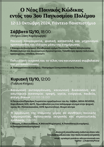 [ENG/GR] Διήμερο εκδηλώσεων 12-13 Οκτώβρη, Πάντειο Πανεπιστήμιο: "Ο Νέος Ποινικός κώδικας εντός του Τρίτου Παγκοσμίου Πολέμου"