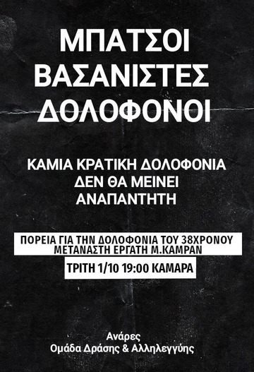 On the morning of 21st of September, Mohammed Kamran is found dead in the Ag. Panteleimonas police station. The fisrt news leaked by his torturers, Hellenic Police, claim that he died by "natural causes" . Instead, his family that was looking for him for a week, finds out that he was tranfered to 5 different police stations in Athens and tha his body is covered by signs of beating. It is more than obvious that Hellenic Police have tortured and murdered yet another migrant, M. Kamran.