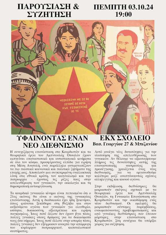 Στην εκδήλωση, διεθνίστριες θα μοιραστούν σκέψεις σχετικά με τα θεωρητικά έργα του Αμπντουλάχ Οτσαλάν, τη Γυναικεία Επανάσταση στο Κουρδιστάν και την οικοδόμηση ενός νέου διεθνισμού. Οι ομιλητές θα μοιραστούν σύντομες παρεμβάσεις, ενσωματώνοντας προβληματισμούς και από γυναίκες διεθνίστριες που έπεσαν μάρτυρες στην επανάσταση στο Κουρδιστάν. Στη συνέχεια θα υπάρξει χώρος για συζήτηση.