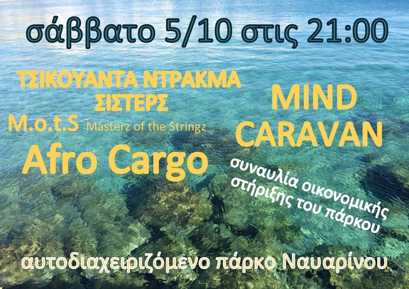 ΤΣΙΚΟΥΑΝΤΑ ΝΤΡΑΚΜΑ ΣΙΣΤΕΡΣ /M.o.t.S Masterz of the Stringz/ MIND CARAVAN / AFRO CARGO παίζουν για το Αυτοδιαχειριζόμενο πάρκο Ναυαρίνου.