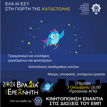 Την Παρασκευή 27/9 πραγματοποιήθηκε στο Πολυτεχνείο της Αθήνας η Βραδιά του Ερευνητή. Ο νέος πρύτανης του ΕΜΠ Χατζηγεωργίου την ίδια ημέρα, αποφάσισε να προχωρήσει σε ένα άτυπο lockdown, αφήνοντας ανοιχτή μόνο την είσοδο της οδού Πατησίων, στην οποία μάλιστα τοποθέτησε ασφαλίτες και κάθε λογής μπάτσους, ώστε να την φυλάνε αλλά και να απαγορεύουν την είσοδο σε όποιον και όποια τους φαινόταν ύποπτος, προχωρώντας με αυτό τον τρόπο και σε προσαγωγές ατόμων. Την ίδια στιγμή το Σωματείο των Εργαζομένων στην Έρευνα, αποφάσισε να κάνει παρέμβαση στην εκδήλωση, ώστε να αναδείξει τα σοβαρά εργασιακά ζητήματα του κλάδου. Ο Χατζηγεωργίου, μη αρκούμενος στον ήδη ασφυκτικό κλοιό που δημιούργησε στα πέριξ του Πολυτεχνείου, αποφάσισε να καλέσει μονάδες της ΟΠΚΕ, οι οποίοι ξυλοκόπησαν και προσήγαγαν κόσμο που βρισκόταν εκείνη την στιγμή μέσα στους διαδρόμους του κτιρίου. Από τις προσαγωγές αυτές, οι 11 κατέληξαν σε συλλήψεις. Μέσα σε αυτές τις συλλήψεις βρίσκονταν και αλληλέγγυος κόσμος αλλά και συνδικαλιστές στην έρευνα.