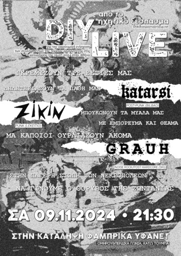 D.I.Y. live από Ηχητικό Ξέσπασμα στην κατάληψη Φάμπρικα Υφανέτ, με Katarsi (Bilbao), Zikin (Lekeitio), Grauh (Saloniki).