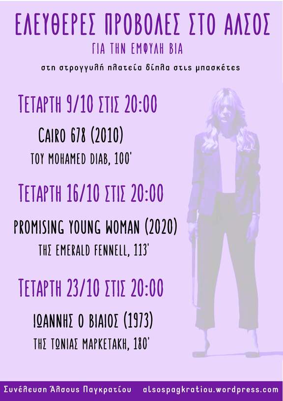 Ελεύθερες προβολές στο Άλσος Παγκρατίου, για την έμφυλη βία Τετάρτη 9/10 "CAIRO 678"