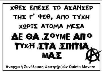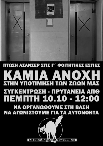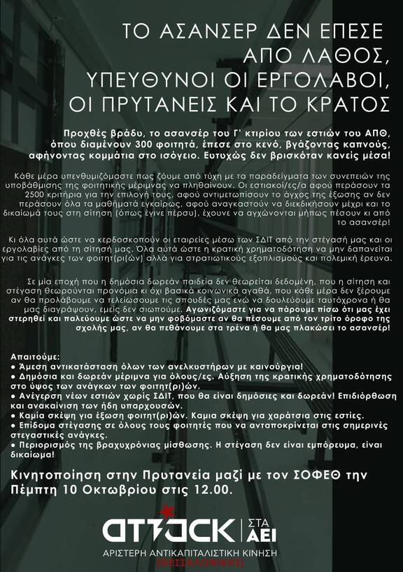 Το βράδυ της Δευτέρας 07/10 στο Γ' κτίριο των εστιών του ΑΠΘ το ασανσέρ έκανε ελεύθερη πτώση, χωρίς -ευτυχώς- να βρίσκεται κάποιο άτομο μέσα σ'αυτό. Την επόμενη ημέρα πραγματοποιήθηκε κινητοποίηση στις εστίες από φοιτητ(ρι)ες που διαμένουν στις εστίες αλλα και αλληλέγγυο κόσμο, με τον υπέυθυνο των εστιών, την αντι-πρύτανη και τον εργολάβο να αποποιούνται κάθε ευθύνη και να προσπαθούν να τα ρίξουν ο ένας στον άλλον ή ακόμη και στους φοιτητές/φοιτήτριες, λέγοντας πως ήταν ένα τυχαίο γεγονός, καθώς έλεγχοι για τη λειτουργία του ασανσέρ πραγματοποιούνται κανονικά. Είναι γνωστή η παραμέληση των εστιών, της σίτισης και της δημόσιας παιδείας συνολικά από το κράτος και τους μηχανισμούς του και ξέρουμε πως έχουν την πλήρη ευθύνη. Σε κάθε προσπάθεια παραμέλησης και αποστείρωσης του πανεπιστημίου και υποτίμησης των ζωών μας θα μας βρίσκουν απέναντι.