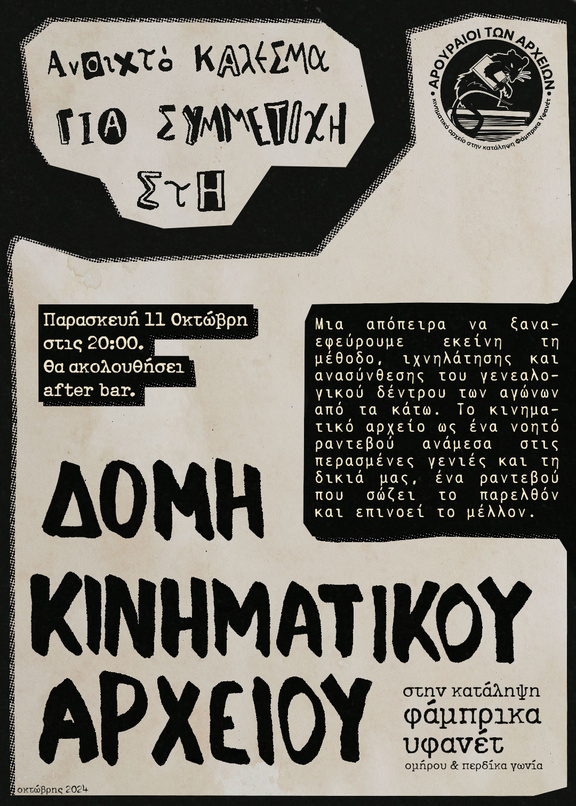 Μια απόπειρα να ξαναεφεύρουμε εκείνη τη μέθοδο ιχνηλάτησης και ανασύνθεσης του γενεαλογικού δέντρου των αγώνων από τα κάτω. Το κινηματικό αρχείο ως ένα νοητό ραντεβού ανάμεσα στις περασμένες γενιές και τη δικιά μας, ένα ραντεβού που σώζει το παρελθόν και επινοεί το μέλλον.