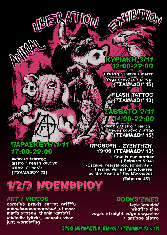 Έκθεση, distro, vegan κουζίνα, animal liberation merch (κτήριο Τσαμαδού 15)