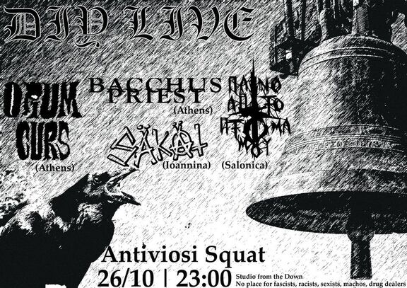 Χειμωνιάζει! και η αλήθεια είναι πως ένα Live με σκληρό ήχο ίσως μας βοηθήσει να το χωνέψουμε, γι' αυτό η ομάδα του Studio from the Down δεν μπορούσε παρά να κάνει αυτή τη σκέψη πραγματικότητα! Με προσκεκλημένους τους Bacchus Priest ( https://bacchuspriest.bandcamp.com/album/pate… ) και Opium Curs ( https://opiumcurs.bandcamp.com/album/yells ) από την πρωτεύουσα, τους Πάνω απ' το Πτώμα μου από τα βόρεια και τους ντόπιους Sakat, για ένα χειμωνιάτικο live του οποίου τα έσοδα θα διατεθούν για δικαστικά έξοδα συντρόφων. Τα λέμε στις 26/10 στην κατάληψη Αντιβίωση.