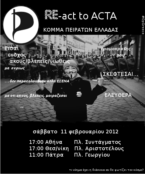 Ήρθε η ώρα να πάρουμε τα πράγματα στα χέρια μας. Το Σάββατο 11 Φλεβάρη σε όλες τις πρωτεύουσες της Ευρώπης κινήματα και οργανώσεις αντιστέκονται και καλούν σε πανευρωπαϊκή ημέρα διαμαρτυρίας ενάντια στην ACTA σε μία πρόγευση του τι είμαστε έτοιμοι να κάνουμε για την αποτροπή της κύρωσής της. Στις 17:00 της ίδιας ημέρας συμμετέχουμε και καλούμε όλους να συμμετέχουν σε συγκέντρωση στην πλατεία Συντάγματος κατά της ACTA και όσων υποτίθεται ότι μας εκπροσωπούν με την υπογραφή της.
