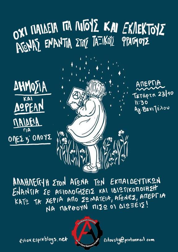 ΚΑΛΕΣΜΑ ΣΥΜΜΕΤΟΧΗΣ ΣΤΗΝ ΑΥΡΙΑΝΗ ΤΕΤΑΡΤΗ 23/10 ΑΠΕΡΓΙΑΚΗ ΣΥΓΚΕΝΤΡΩΣΗ ΤΩΝ ΕΚΠΑΙΔΕΥΤΙΚΩΝ ΠΡΩΤΟΒΑΘΜΙΑΣ & ΔΕΥΤΕΡΟΒΑΘΜΙΑΣ (ΔΟΕ, ΕΛΜΕ & ΠΟΣΕΕΠΕΑ) ΣΤΙΣ 11:30 ΣΤΟ ΑΓΑΛΜΑ ΒΕΝΙΖΕΛΟΥ