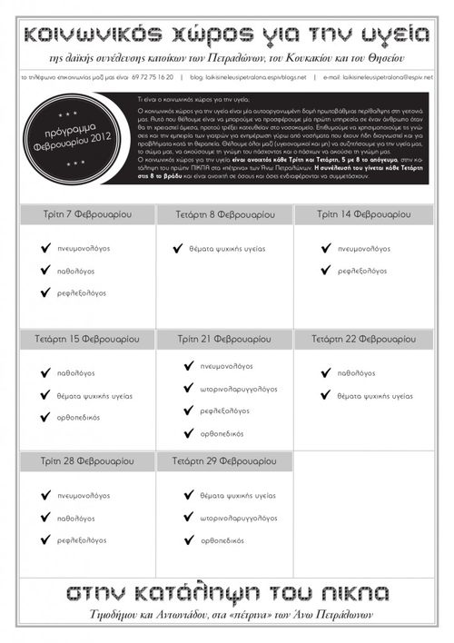 Για τον μήνα Οκτώβριο, λοιπόν, ο κοινωνικός χώρος για την υγεία θα λειτουργεί κάθε Τρίτη (5 με 8 το απόγευμα και Τετάρτη (5.30 με 8 το απόγευμα). Την Τετάρτη στις 8 γίνεται και η ανοιχτή συνάντηση της σχετικής ομάδας εργασίας της λαϊκής συνέλευσης.