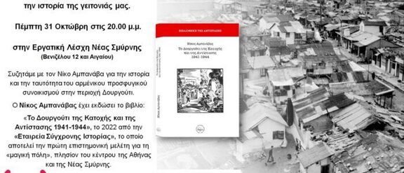 Την Πέμπτη 31 Οκτωβρίου στις 20.00 μ.μ. στην Εργατική Λέσχη Νέας Σμύρνης (Βενιζέλου 12 και Αιγαίου) θα πραγματοποιηθεί εκδήλωση για την Ιστορία του Δουργουτίου, την ιστορία της γειτονιάς μας.