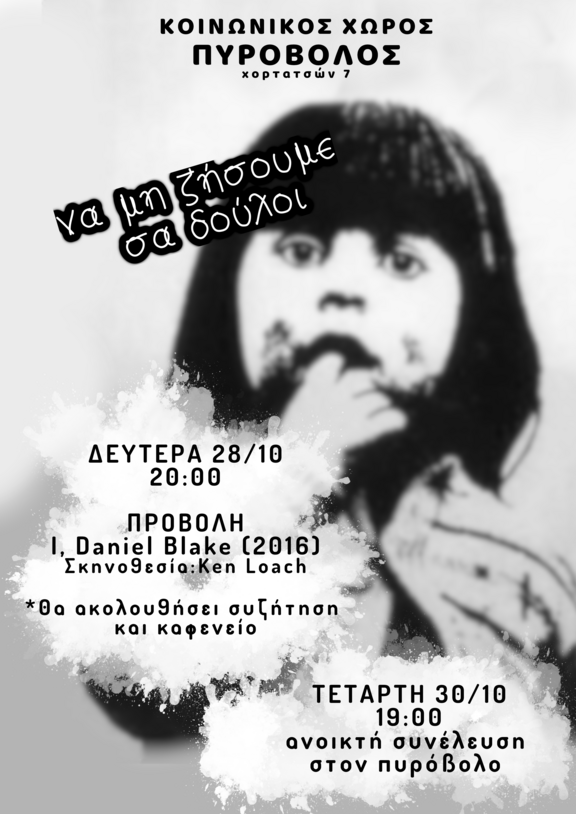 Προβολή και συζήτηση στον Κ.Χ. Πυρόβολος της ταινίας "I, Daniel Blake (2016)" σκηνοθεσίας Ken Loach.