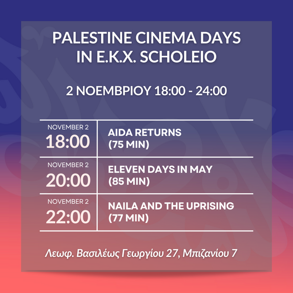 بالتعاون مع "فيلم لاب فلسطين"، نستضيف "أيام السينما الفلسطينية حول العالم" لهذا العام في سالونيك من خلال عرض 6 أفلام فلسطينية في مكانين.
