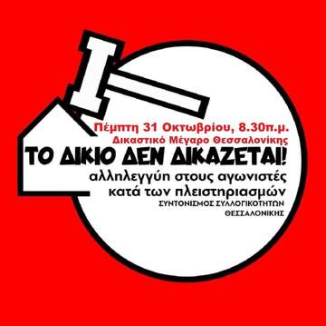 Στις 31 του Οκτώβρη θα συνεχιστεί για 3η μέρα η δίκη των 5 μελών του κινήματος κατά των πλειστηριασμών στη Θεσσαλονίκη - Συγκέντρωση συμπαράστασης στις 8.30π.μ., στο Δικαστικό Μέγαρο Θεσσαλονίκης