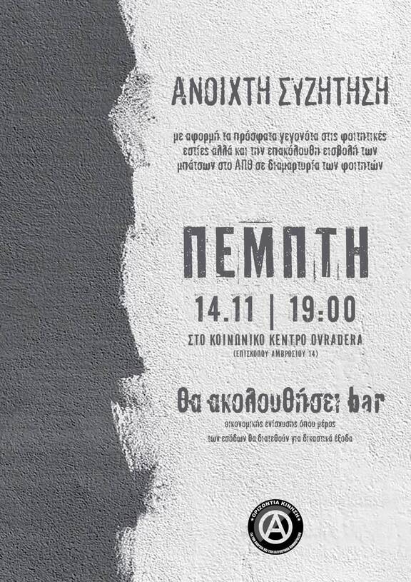 ❗Αυτή την Πέμπτη, 14/11, στις 19:00, στο Κοινωνικό Κέντρο Ovradera, καλούμε σε Ανοιχτή Συζήτηση με αφορμή τα πρόσφατα γεγονότα στις Φοιτητικές Εστίες Θεσσαλονίκης και την εισβολή των μπάτσων στο ΑΠΘ σε διαμαρτυρία φοιτητ(ρι)ών.