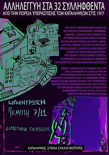 Κάλεσμα σε συγκέντρωση αλληλεγγύης για τις 32 συλλήψεις από την πορεία υπεράσπισης των καταλήψεων στις 19/07/2024 - Δικαστήρια Ευελπίδων [κτήριο 7, αίθουσα 2]