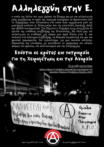 Πλέον, ενάμιση χρόνο μετά την πρωτόδικη απόφαση, εκτός από το ότι ο μαστροπός Μπουγιούκος με δημόσιες αναρτήσεις έχει απειλήσει την Ε., την οικογένειά της καθώς και τον αλληλέγγυο κόσμο που την στήριξε σε όλη αυτή τη διαδρομή, και αφού συνεχίζει απρόσκοπτα το βίο του διατυμπανίζοντας πως εκτός από μαφιόζος, βιαστής και μπάτσος είναι και φασίστας, η αστική δικαιοσύνη αποφασίζει να διώξει την Ε. ώστε να συνεχιστεί αυτή η αλυσίδα συνεχών απειλών, τρομοκρατήσεων και εκδικητικότητας απέναντι σε έναν άνθρωπο που καταγγέλλοντας την εκμετάλλευσή της έριξε φως στα πιο σκοτεινά, σάπια κομμάτια της πραγματικότητας που έχει δημιουργήσει ο βάρβαρος κόσμος κράτους και καπιταλισμού.