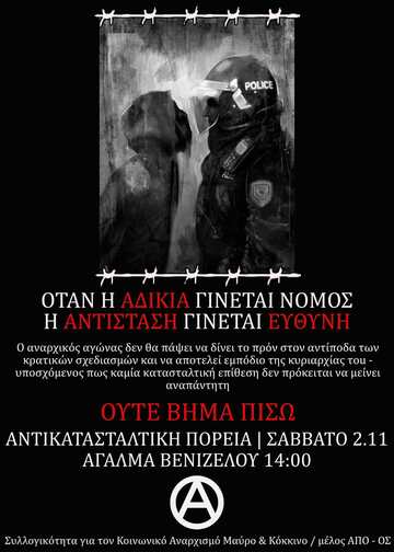 Καλούμε σε στήριξη της αντικατασταλτικής πορείας σήμερα Σάββατο 2/11, στις 14:00 στο Άγαλμα Βενιζέλου.