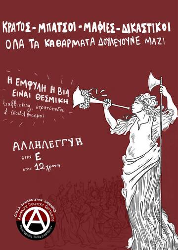 Δεν θα σταματήσουμε να φωνάζουμε ότι η έμφυλη βία είναι θεσμική. Γεννιέται, θρέφεται και στη συνέχεια ξεπλένεται μέσα στους κόλπους των κρατικών και παρακρατικών μηχανισμών, μέσα στις συνθήκες της ταξικής ανισότητας, της πατριαρχίας και του κοινωνικού εκφασισμού. Εκείνων των μηχανισμών που αθώωσαν τους μπάτσους δολοφόνους του Ζακ, που αποφυλάκισαν τον αστυνομικό-ματροπό Μπουγιούκο στην υπόθεση trafficking της Ηλιούπολης (όπου συμμετείχαν μέλη του ίδιου κυκλώματος που εξέδιδε και την 12χρονη), των μηχανισμών που άφησαν την Κυριακή Γρίβα να χάσει τη ζωή της στα χέρια του κακοποιητή της έξω από το Α.Τ. αγ. Αναργύρων, που ξεπλένουν γυναικοκτόνους και βιαστές, που νομιμοποιούν την κατασταλτική βία που βιώνουμε ως αγωνιζόμενες…