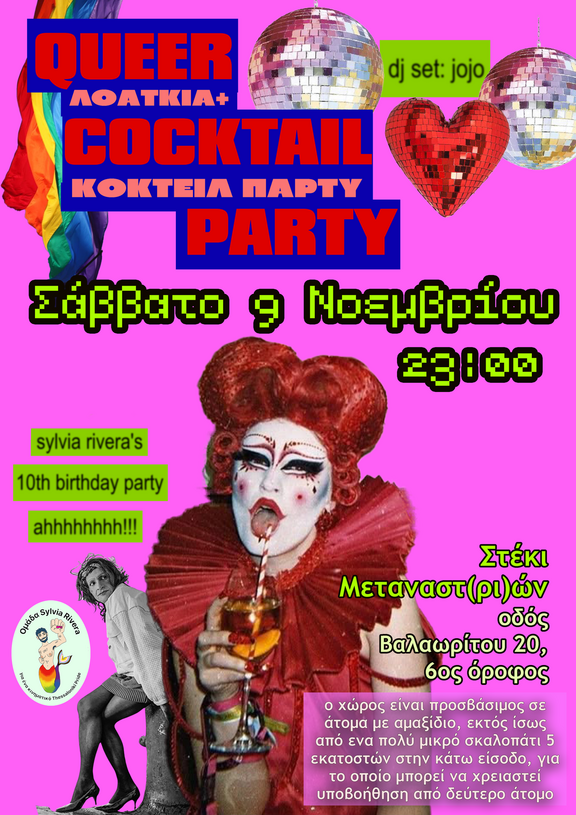 H Sylvia μας γίνεται 10 χρονών και μία ultra queer παρτάρα επιβάλλεται. Φοράμε τα καλά μας (γκλιτεράτα και cunty) και πίνουμε σπέσιαλ κοκτειλάρες. Μουσική; Μην ανησυχείς αγάπη, θα το κουνήσουμε με τα brattiest, hottest pop, rnb και regeatton hits. Οπότε τα λέμε Σάββατο 9 Νοεμβρίου στις 23:00 στο στέκι μεταναστ(ριών), οδός Βαλαωρίτου 20, 6ος όροφος.