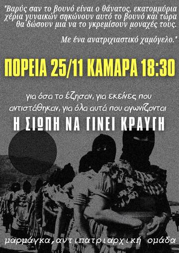 Από την γυναικοκτονία της Κυριακής Γρίβα έξω από το ΑΤ Αγίων Αναργύρων και της Όλγας στο Αγρίνιο μέχρι την Ιρανή μαθήτρια που αυτοκτόνησε ύστερα από τις απειλές του διευθυντή της. Από τα χιλιάδες κυκλώματα trafficking, την υπόθεση της 12χρονης από τον Κολωνό και της Ε. από την Ηλιούπολη, μέχρι το κύκλωμα σωματεμπορίας που διακινούσε γυναίκες από την Κολωμβία έχοντας την πλήρη κρατική συγκάλυψη. Από την κοπέλα στη Μυτιλήνη που κατήγγειλε τον βιασμό της μέχρι της Ιρανή φοιτήτρια που έβγαλε τα ρούχα της στο προαύλιο του πανεπιστημίου ως ένδειξη αντίστασης απέναντι στην κρατική αυθαιρεσία και ύστερα βασανίστηκε και κλείστηκε σε ψυχιατρικό ίδρυμα. Από τους αγώνες που δίνονται κατά της υποχρεωτικής ενδυμασίας του χιτζαμπ, μέχρι τις διαμαρτυρίες γυναικών στις ΗΠΑ ενάντια στην αμφισβήτηση του δικαιώματος της άμβλωσης. Σιωπηρές γυναικοκτονίες ανά τον κόσμο, ονόματα γυναικών που δεν ακούγονται ποτέ στον δημόσιο διάλογο. Βιασμοί και ξυλοδαρμοί στα σύνορα, σε στρατόπεδα, πίσω από τα σίδερα φυλακών. Γυναίκες εν καιρώ πολέμου που εξευτελίζονται και χάνουν την ζωή τους ως ένδειξη υποδούλωσης στην πολεμική μηχανή του συστήματος. Όλα τα παραδείγματα έχουν ως κοινό παρονομαστή την πατριαρχία και έτσι το αίμα χιλιάδων αδερφών μας -ανώνυμων ή μη - ανά τον κόσμο θυσιάζεται στο βωμό της εξουσίας.