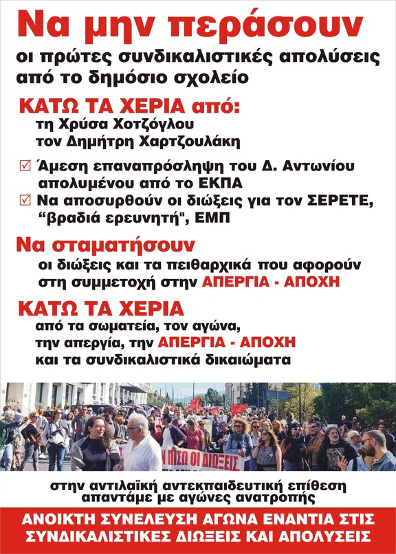 ΣΥΝΕΧΙΖΟΥΜΕ ΠΙΟ ΑΠΟΦΑΣΙΣΤΙΚΑ ΤΟΝ ΑΓΩΝΑ ΕΝΑΝΤΙΑ ΣΤΙΣ ΣΥΝΔΙΚΑΛΙΣΤΙΚΕΣ ΔΙΩΞΕΙΣ & ΑΠΟΛΥΣΕΙΣ