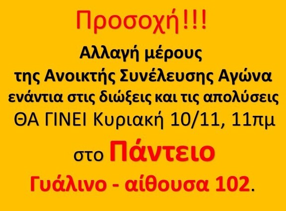 - ΝΕΑ ΑΝΟΙΚΤΗ ΣΥΝΕΛΕΥΣΗ ΑΓΩΝΑ ΚΥΡΙΑΚΗ 10/11 στις 11:00 στο ΠΑΝΤΕΙΟ (ΓΥΑΛΙΝΟ-ΑΙΘΟΥΣΑ 102), για να δούμε και να οργανώσουμε τα επόμενα βήματά μας. Να είμαστε όλοι εκεί!
