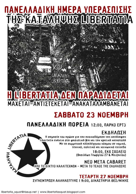 Οι αγώνες για την υπεράσπιση των καταλήψεων απέναντι στην τρομοκρατία κράτους και κεφαλαίου συνεχίζονται, καθώς οι καταλήψεις δεν παραδίνονται, αλλά μάχονται, αντιστέκονται, ανοικοδομούνται κι ανακαταλαμβάνονται. Έτσι, καλούμε σε πανελλαδική μέρα υπεράσπισης της κατάληψης Libertatia και των κατειλημμένων δομών αγώνα το Σάββατο 23 Νοεμβρίου και σε πορεία την ίδια μέρα στις 12.00 στο πάρκο απέναντι από την ΕΡΤ3. Την ίδια μέρα θα ακολουθήσει εκδήλωση για τον αγώνα της ανοικοδόμησης στις 18.00 στον ΕΚΧ Σχολείο, ενώ την Τετάρτη 27/11 στις 09.00 εκδικάζεται η υπόθεση της τρίτης κατά σειρά εισβολής της αστυνομίας ενάντια στον αγώνα της ανοικοδόμησης, που είχε σαν αποτέλεσμα 12 συλλήψεις για το αδίκημα της παράνομης επέμβασης σε διατηρητέο κτίριο και της αντίστασης κατά της αρχής.