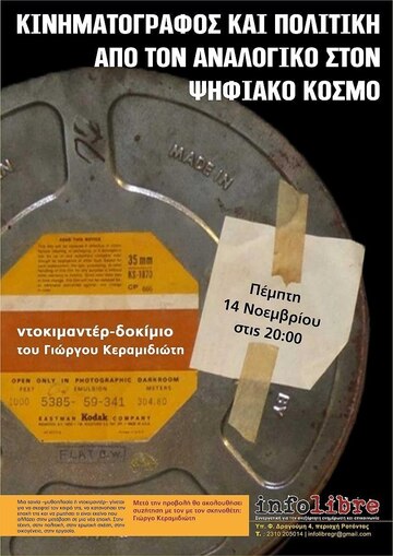 Προβολή της δοκιμιακής ταινίας τεκμηρίωσης του Γιώργου Κεραμιδιώτη «Κινηματογράφος και πολιτική - Από τον αναλογικό στον ψηφιακό κόσμο» (2023) στο χώρο του infolibre, την Πέμπτη 14 Νοέμβρη, στις 20.00.