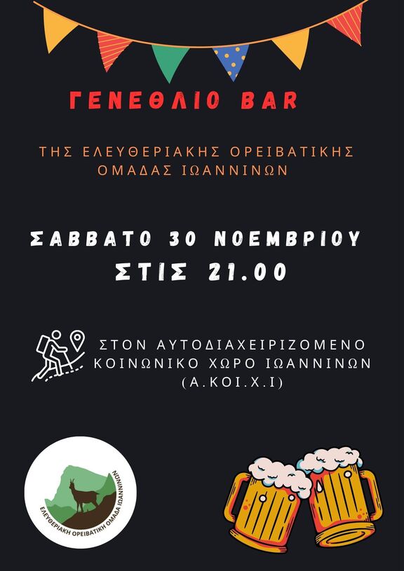Ως ελευθεριακή ορειβατική ομάδα, κλείνουμε ακριβώς 1 χρόνο από την πρώτη ημέρα που ξεκινήσαμε να συνδιαμορφώνουμε και να παίρνουμε τα βουνά. Γι'αυτό σας καλούμε όλ@ στο γενέθλιο bar μας!