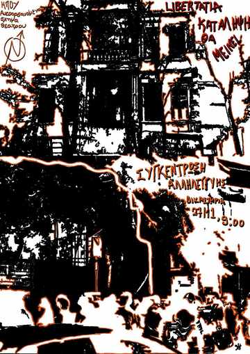 Από μεριά μας δηλώνουμε ότι στεκόμαστε και θα στεκόμαστε πάντα αλληλέγγυοι στις καταλήψεις που επιχειρούν να δημιουργήσουν εντός τους έναν κόσμο ελευθερίας και σε όσους και όσες αγωνίζονται για ένα κόσμο δίχως εξουσία. Να αντισταθούμε στην επέλαση του κράτους, υπερασπίζοντας τις δομές του αγώνα. Στηρίζουμε την πανελλαδική διαδήλωση υπεράσπισης της κατάληψης Libertatia και των κατειλημμένων δομών αγώνα όπως επίσης και την συγκέντρωση αλληλεγγύης στους 12 συλληφθέντες/είσες της 3ης αστυνομικής επιχείρησης στην κατάληψη Libertatia που διώκονται για την ανοικοδόμηση της.