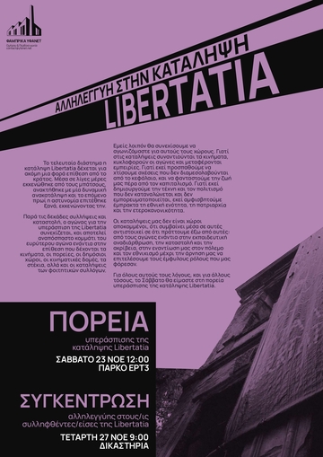 Οι αγώνες για την υπεράσπιση των καταλήψεων απέναντι στην τρομοκρατία κράτους και κεφαλαίου συνεχίζονται, καθώς οι καταλήψεις δεν παραδίνονται, αλλά μάχονται, αντιστέκονται, ανοικοδομούνται κι ανακαταλαμβάνονται. Έτσι, καλούμε σε πανελλαδική μέρα υπεράσπισης της κατάληψης Libertatia και των κατειλημμένων δομών αγώνα το Σάββατο 23 Νοεμβρίου και σε πορεία την ίδια μέρα στις 12.00 στο πάρκο απέναντι από την ΕΡΤ3. Την ίδια μέρα θα ακολουθήσει εκδήλωση για τον αγώνα της ανοικοδόμησης στις 18.00 στον ΕΚΧ Σχολείο, ενώ την Τετάρτη 27/11 στις 09.00 εκδικάζεται η υπόθεση της τρίτης κατά σειρά εισβολής της αστυνομίας ενάντια στον αγώνα της ανοικοδόμησης, που είχε σαν αποτέλεσμα 12 συλλήψεις για το αδίκημα της παράνομης επέμβασης σε διατηρητέο κτίριο και της αντίστασης κατά της αρχής.