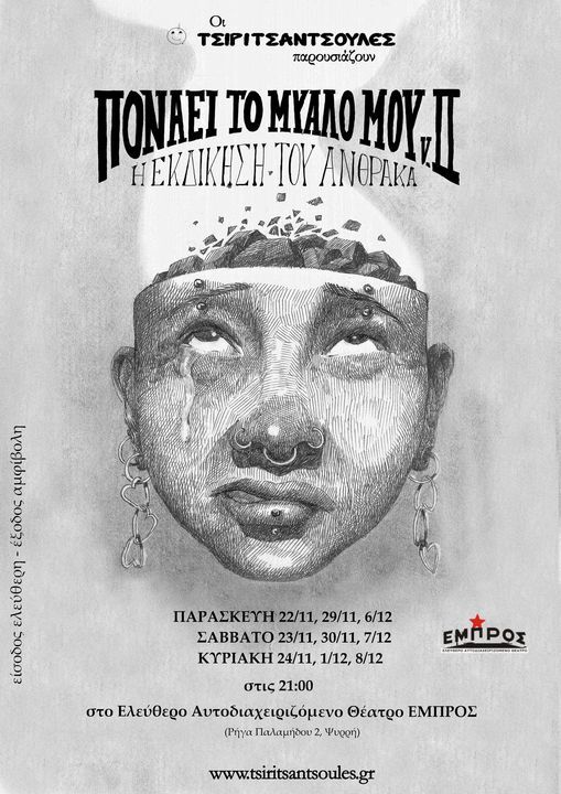 Η θεατρική παράσταση Πονάει το μυαλό μου ν.2 (Η εκδίκηση του άνθρακα) κλείνει τη Φθινοπωρινή της περιοδεία με 9 παραστάσεις στο Ελεύθερο Αυτοδιαχειριζόμενο Θέατρο ΕΜΠΡΟΣ (Ρήγα Παλαμήδου 2, Ψυρρή).